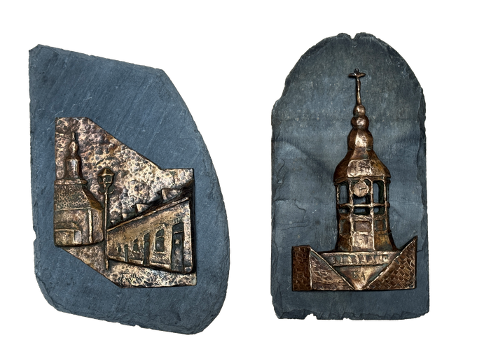 Beide gegoten in massief brons, geplaatst op een authentieke gebruikte daklei. Deels nog van de Grote Kerk zelf.